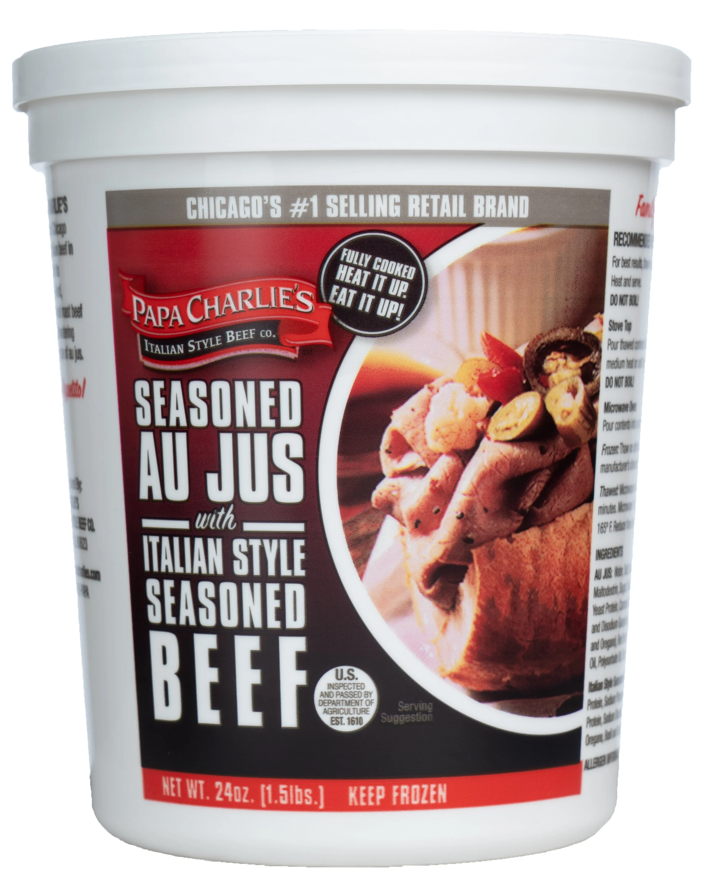 Papa Charlie’s introduced Chicago’s famous Italian beef in 1989 with its one-of-a-kind, slow-cooked roast beef and mouthwatering family recipe of au jus. Papa Charlie’s Retail product line is offered at numerous grocery chains around the Greater Chicago land area and a number of locations through out the country. The retail product line is a frozen, fully cooked, heat and serve product. Best served on warm sandwich rolls and your own personal touch of toppings.